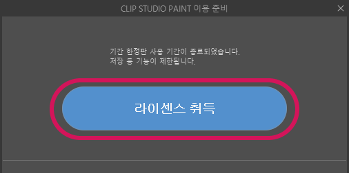2. 업데이트 후 CLIP STUDIO PAINT를 시작하여 오른쪽 화면에서 [라이센스 취득]을 클릭하여 신청하십시오.