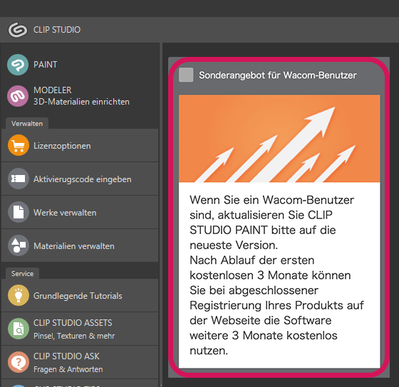 Das kostenlose, 3-monatige Sonderangebot gilt nur für Single-Pläne (Nutzung eines einzelnen Geräts) derselben CLIP STUDIO PAINT-Version (PRO oder EX), die mit deinem Wacom-Produkt geliefert wurde.