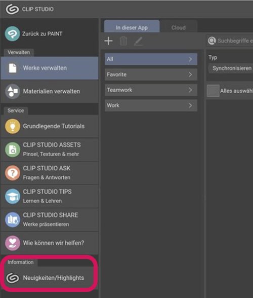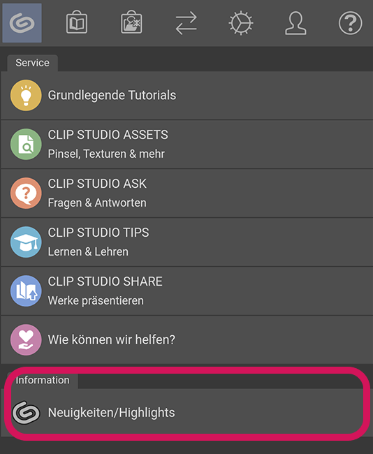 Klicke auf das CLIP STUDIO-Symbol, um Neuigkeiten/Highlights anzeigen zu lassen.