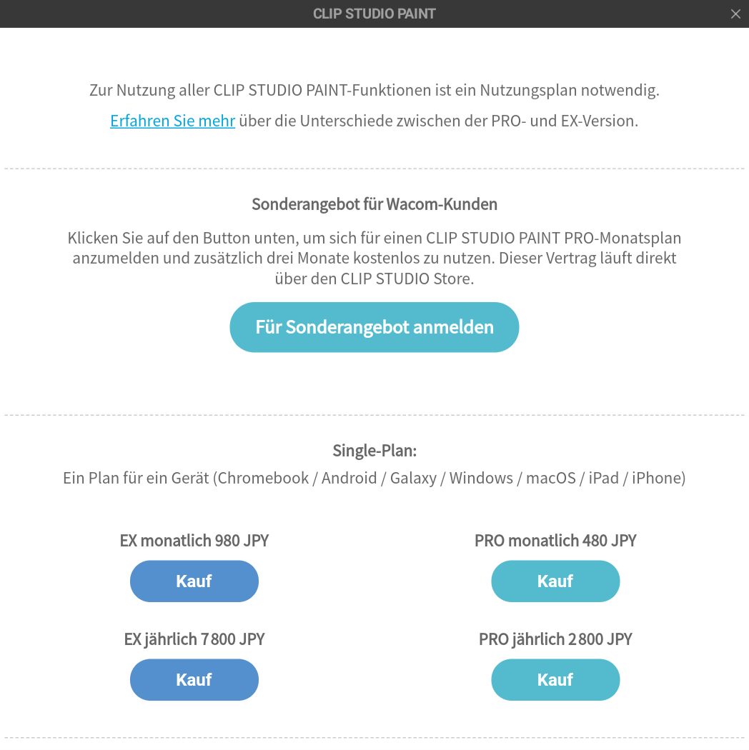 | Wacom Cintiq-Serie | CLIP STUDIO PAINT EX | 3 Monate | 3 Monate | 6 Monate |