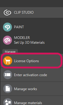 2. Once you have updated to the latest version, launch Clip Studio Paint and click [Purchase a license] on the right of the screen, or alternatively, click [License Options] from the menu on the left.