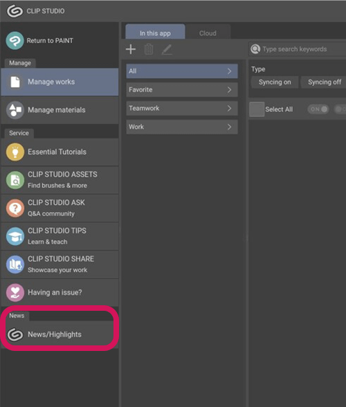 Tap on the Clip Studio Icon to bring up News/Highlights.