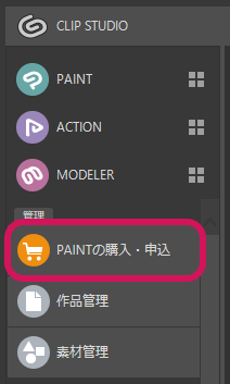 2. PAINTが最新バージョンになりましたら、CLIP STUDIOを起動し、右の画面から[ライセンスを入手]をクリックするか、左メニューの「PAINTの購入・申込」をクリックしてください。