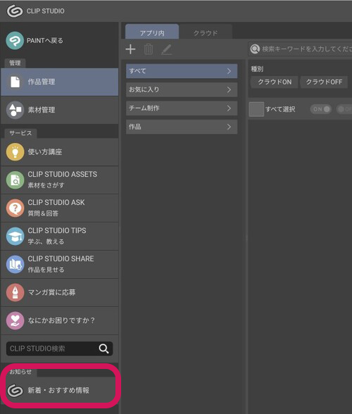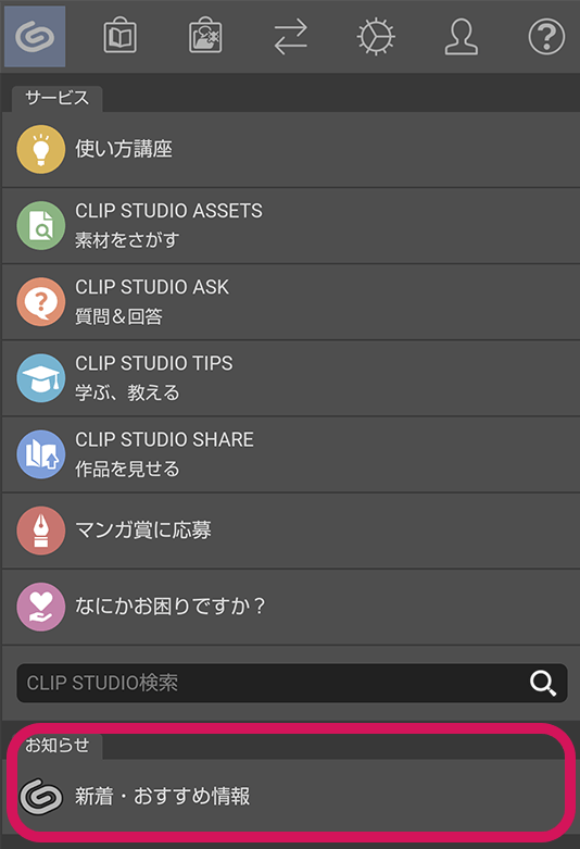 新着情報はCLIP STUDIOのアイコンから表示できます。