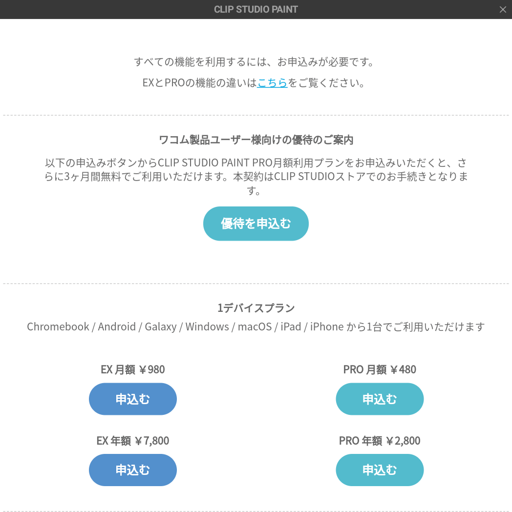 3ヶ月無料の優待はワコム製品に付属していたPAINTと同じグレード(PROまたはEX)の1デバイスプランに限りご利用いただけます。