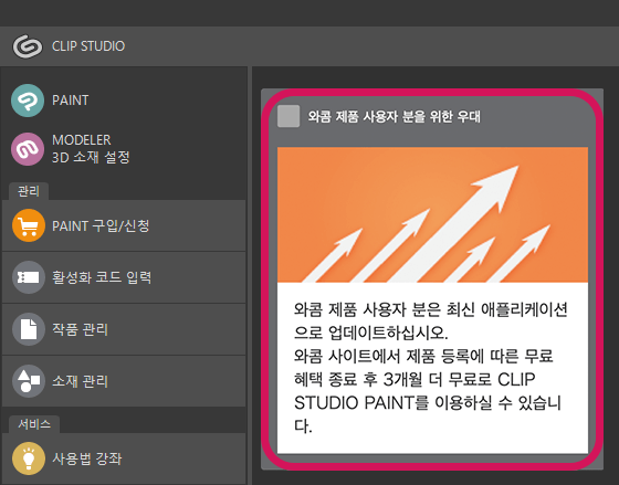 1. CLIP STUDIO를 시작하여 오른쪽 안내에서 신청 화면으로 이동하십시오. 1.9.9 이전 버전을 사용 중인 경우 PAINT를 최신 버전으로 업데이트하십시오.