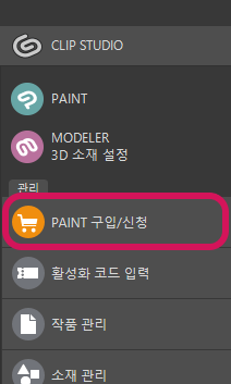 2. PAINT를 최신 버전으로 업데이트한 후 CLIP STUDIO를 시작하여 오른쪽 화면에서 [라이센스 취득]을 클릭하거나 왼쪽 메뉴의 PAINT 구입/신청을 클릭하십시오.