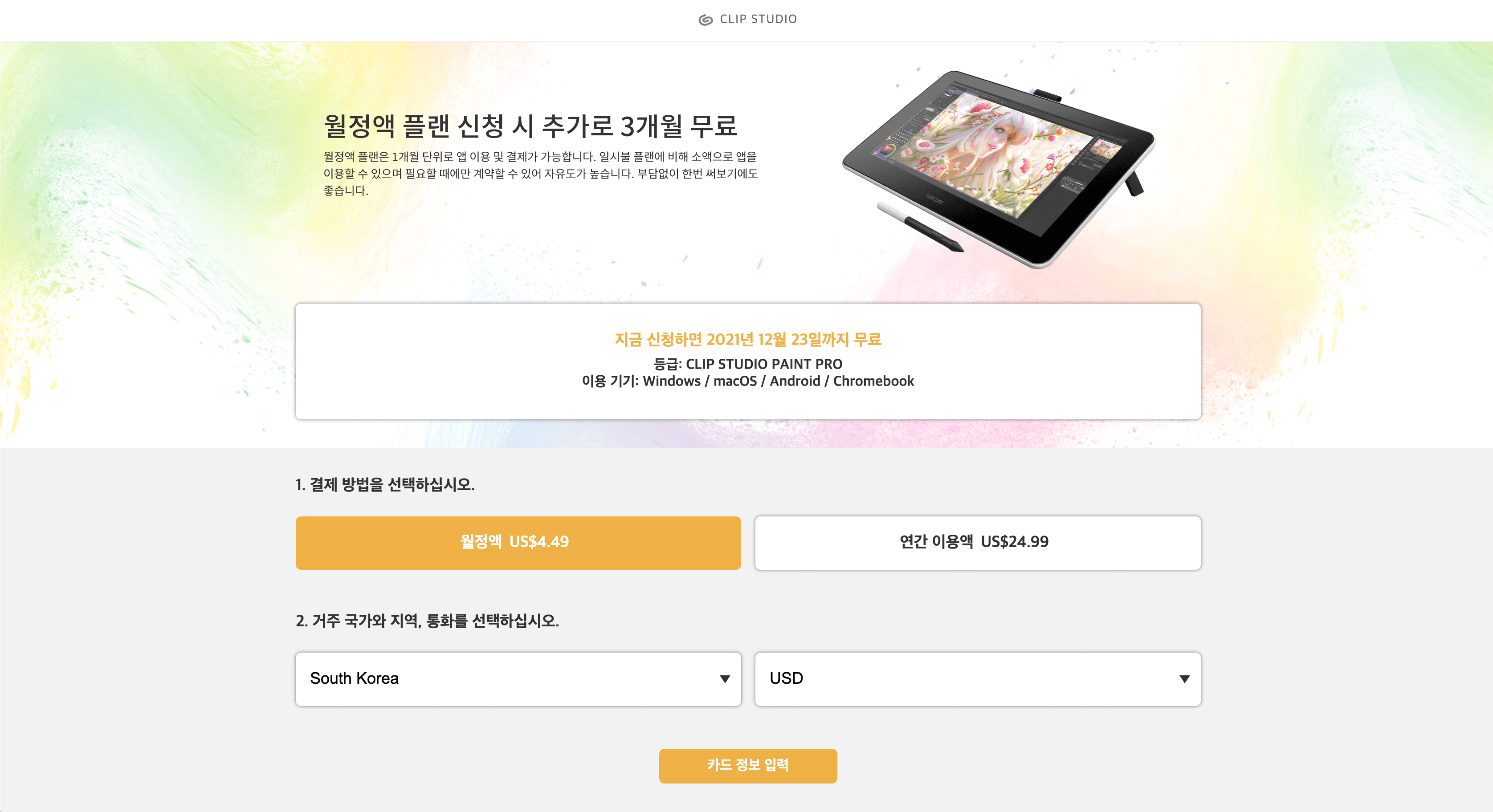 와콤 사이트에서의 제품 등록에 따른 무료 특전 기간이 끝나면 우대 플랜을 신청하실 수 있습니다.
