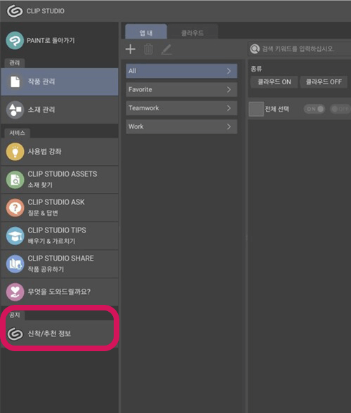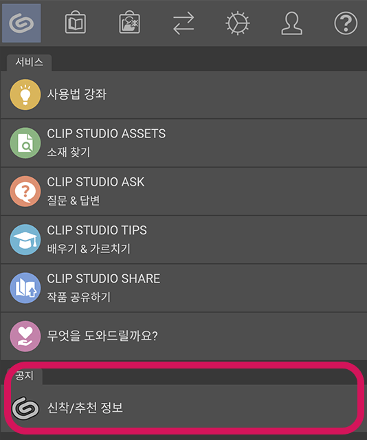 신착 정보는 CLIP STUDIO 아이콘을 탭하면 표시할 수 있습니다.