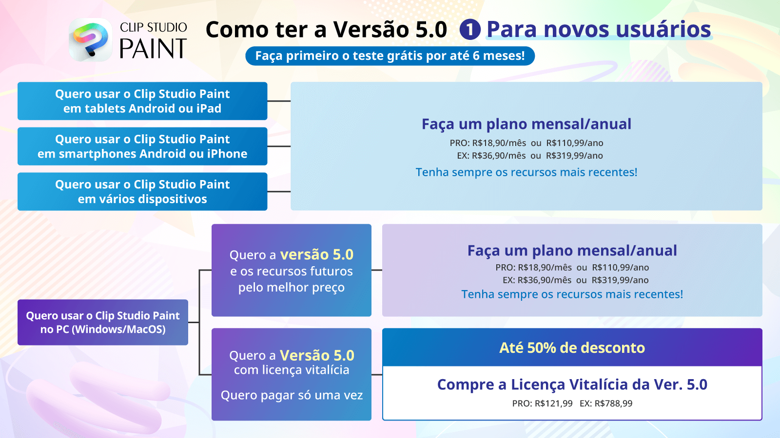 Usuários que atualmente possuem um plano mensal ou anual (contratado pelo site do Clip Studio ou pelas lojas de aplicativos) ou o Passe de Atualização já podem atualizar para a Ver. 5.0 a partir de hoje. Quem possui uma licença vitalícia da Ver. 4 ou anterior (Windows/macOS) pode utilizar a Ver. 5.0 adquirindo um Passe de Atualização ou um upgrade com desconto.