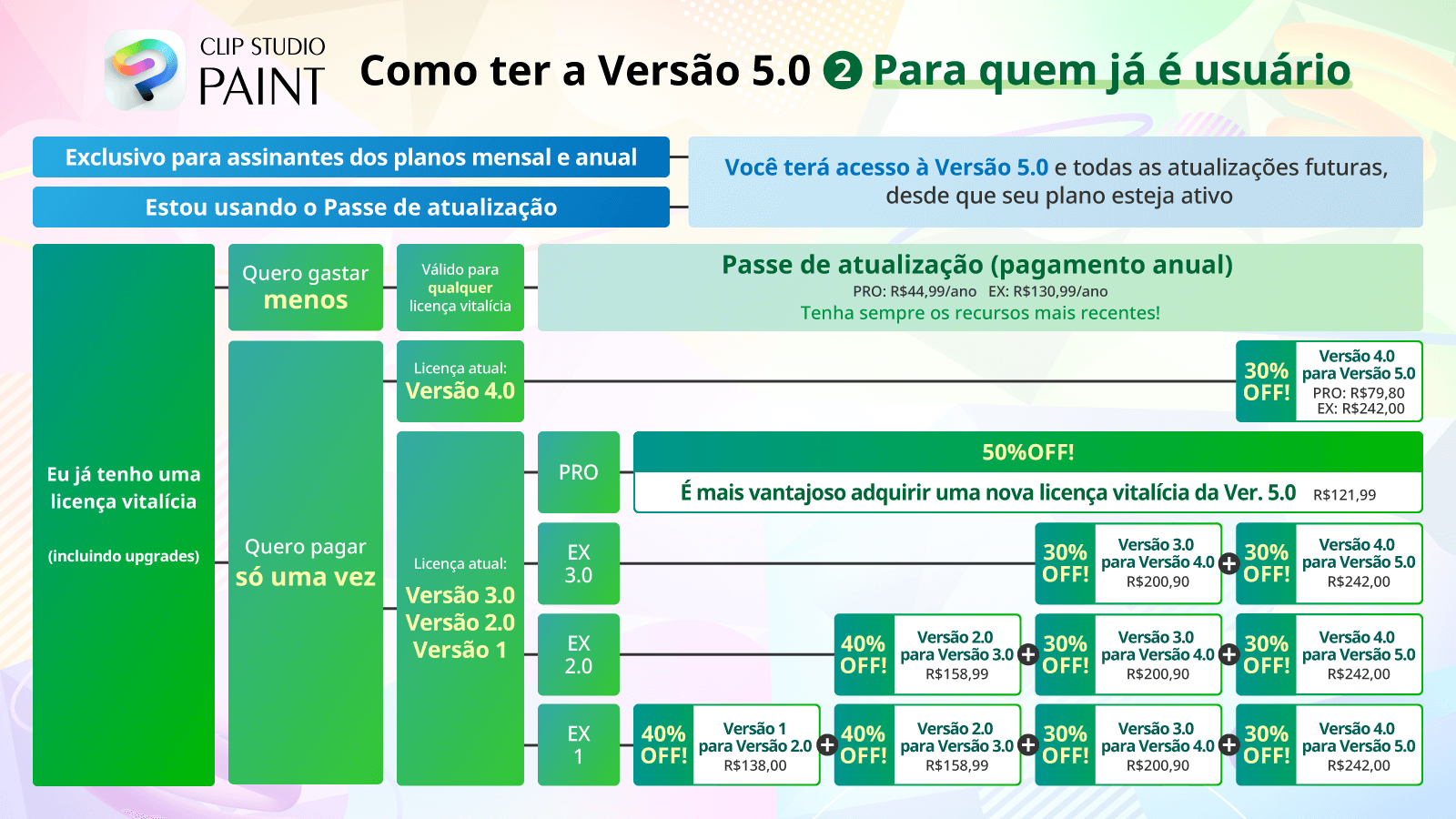 A forma como você pode ter acesso a Ver. 5.0 vai variar de acordo com o seu status atual de uso do Clip Studio Paint.