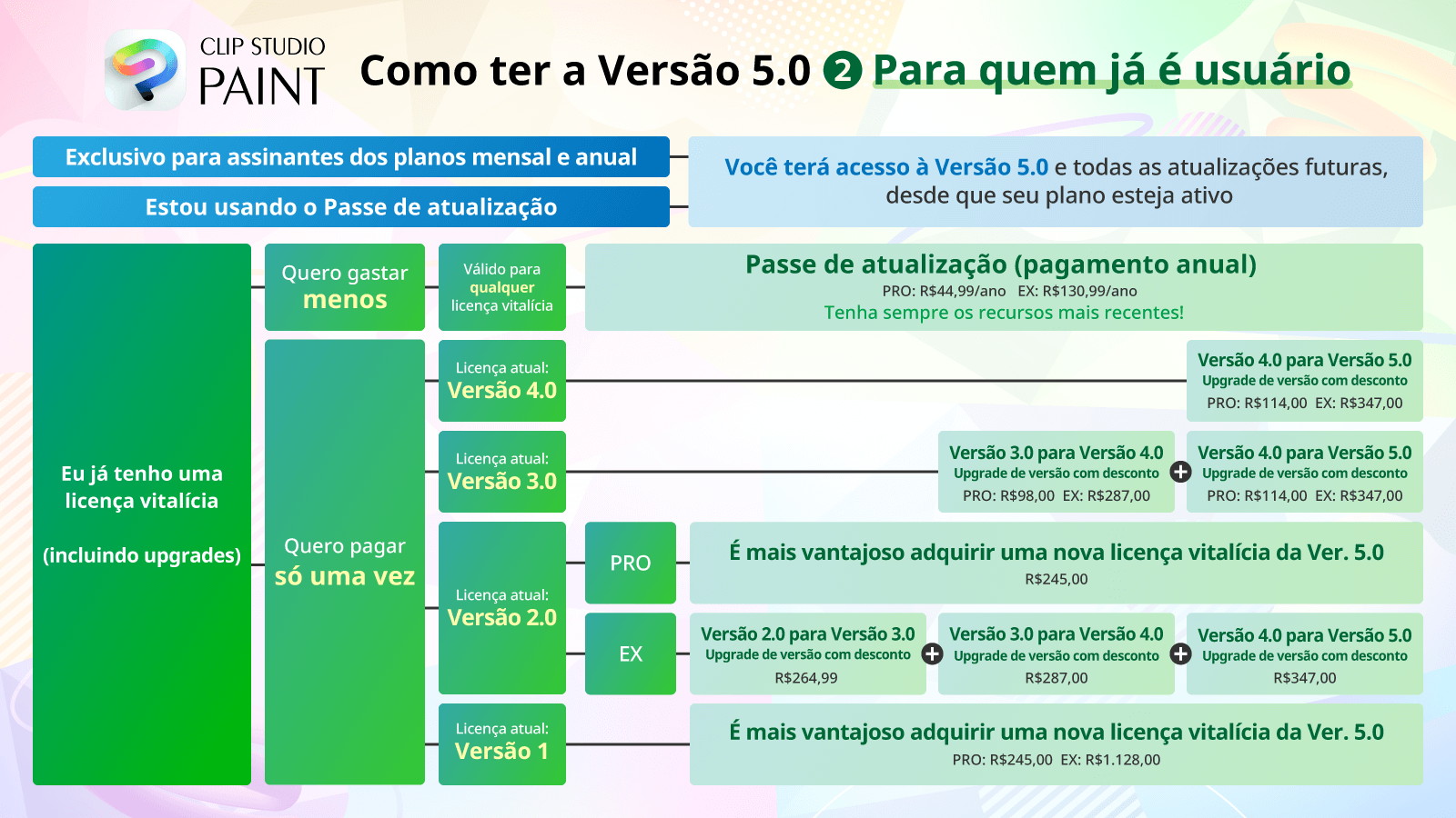 A forma como você pode ter acesso a Ver. 5.0 vai variar de acordo com o seu status atual de uso do Clip Studio Paint.