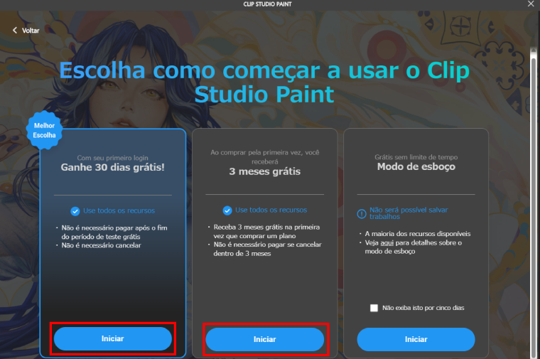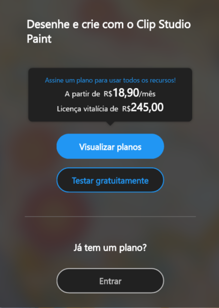 • - 30 dias grátis ao fazer o primeiro login... Ao criar uma conta Clip Studio, você pode usar o programa gratuitamente por 30 dias.