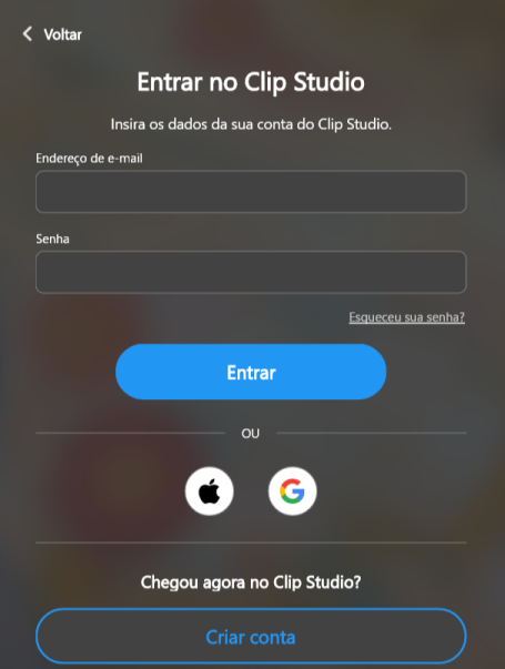 Sua conta Clip Studio pode ser vinculada à sua Apple ID ou conta do Google. Para mais detalhes, consulte aqui.