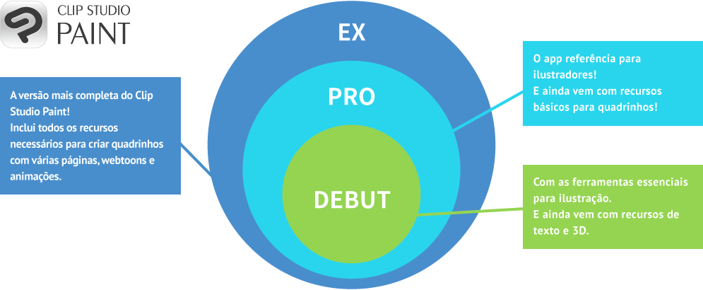 | Quadrinhos | Crie quadrinhos coloridos ou em preto e branco. Algumas funções não estão disponíveis na versão DEBUT. | ✓ | ✓ | (✓) |