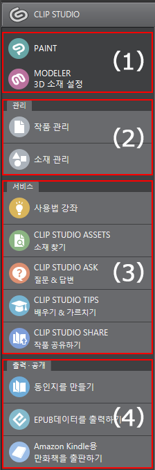 애플리케이션을 기동하면 "CLIP STUDIO START" 화면이 표시됩니다.