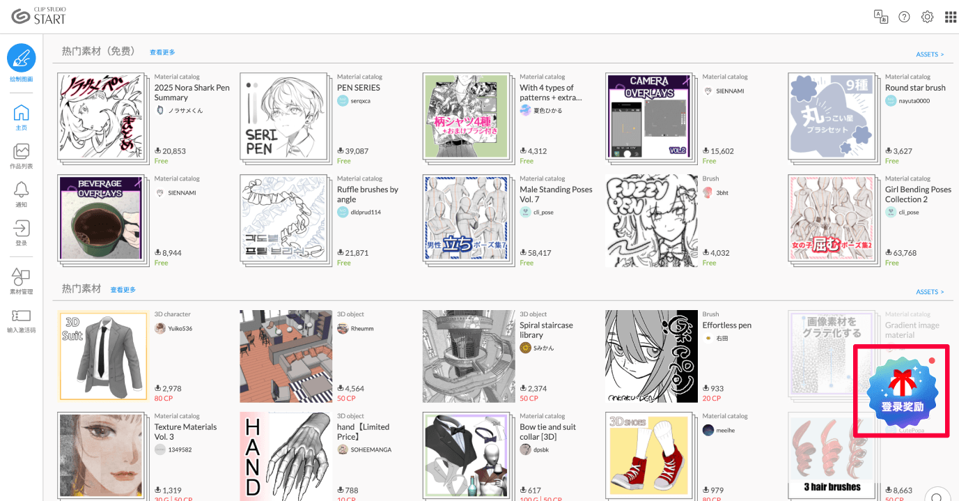 开启 Clip Studio 后,于主页点击“登录奖励”,登录 Clip Studio 账户。