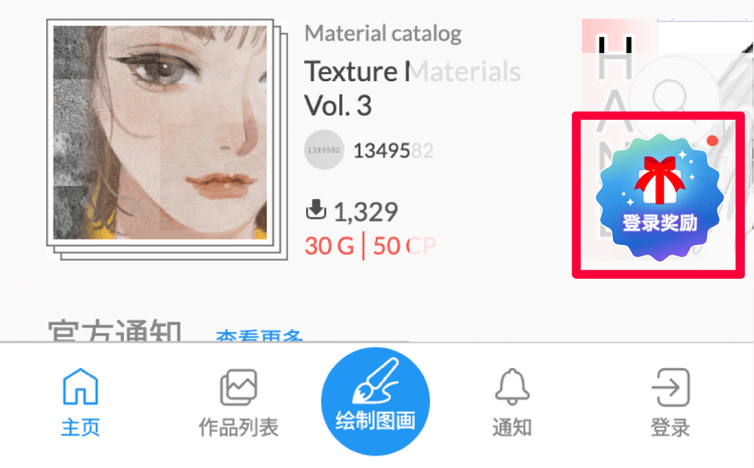 开启应用后,于主页点击“登录奖励”,登录 Clip Studio 账户。