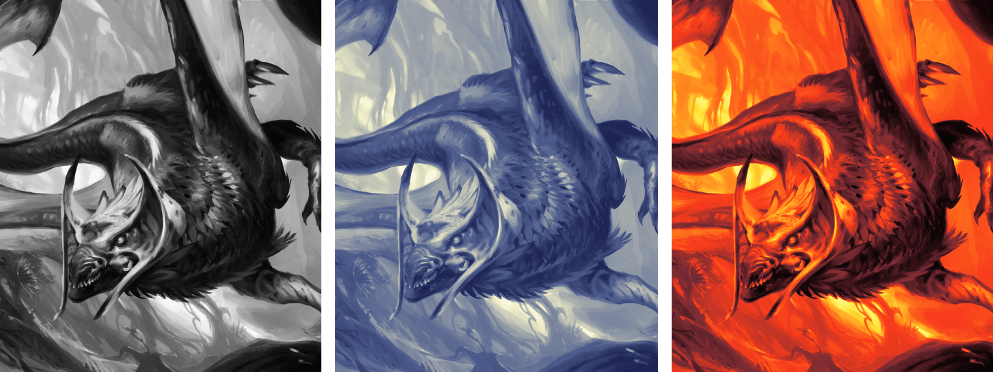在概念藝術製作中,由於經常需要快速進行修改工作,因此精通選擇與調整工具相當重要。例如,可選取特定顏色範圍,或是進行柔化選擇範圍邊緣等變形處理。甚至可以使用漸層對應來更改整體配色方案,或微調特定範圍的飽和度與色相。