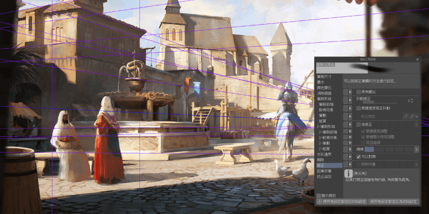 透視尺規是環境插圖與室內設計的概念藝術不可或缺之工具。初期階段的草圖可能不需嚴格的透視,但在後期階段,精確的透視十分重要。使用CLIP STUDIO PAINT的透視尺規,可以精確地沿著透視繪製建築物和窗戶等物件。