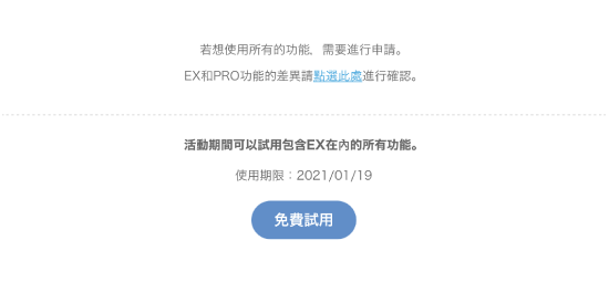 點選 [P]圖示選單→[變更應用程式的購買・等級/支付方案]→[免費試用]按鈕。