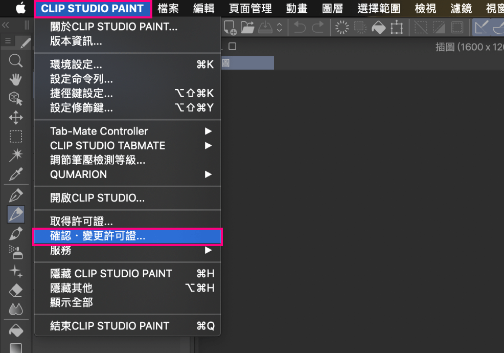 點擊[CLIP STUDIO PAINT]選單→[確認・變更許可證]→[所持有的許可證],按下CLIP STUDIO PAINT EX 30天免費的[啟動]按鈕