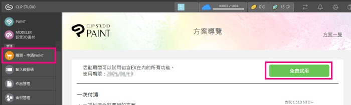 啟動CLIP STUDIO,點選[購買・申請PAINT]→[免費試用]按鈕
