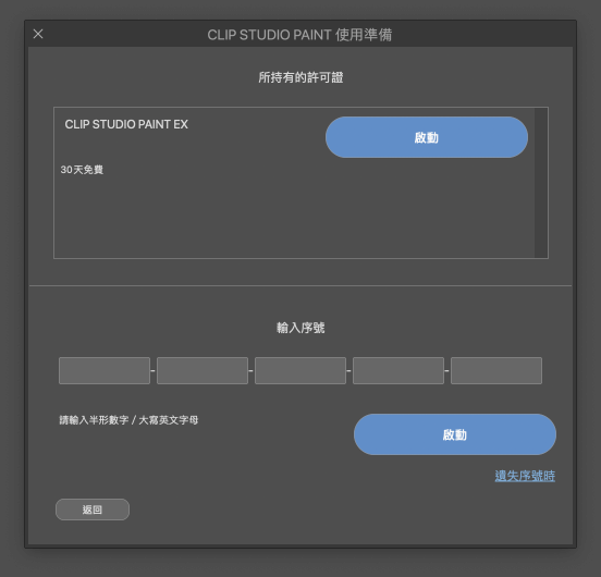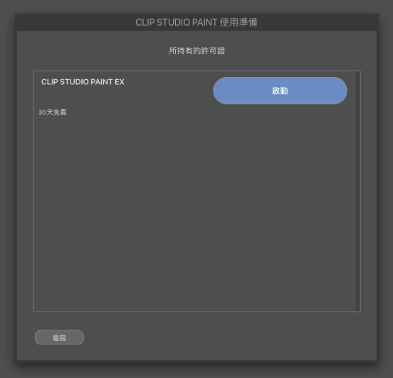 點選[說明]選單→[確認・變更許可證]→[所持有的許可證],按下CLIP STUDIO PAINT EX 30天免費的[啟動]按鈕