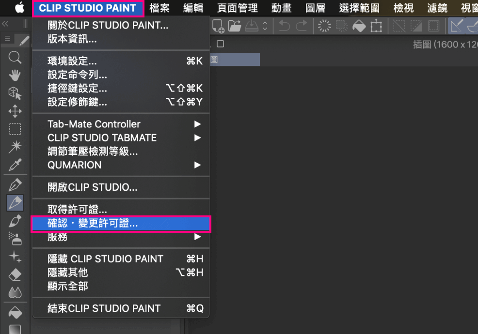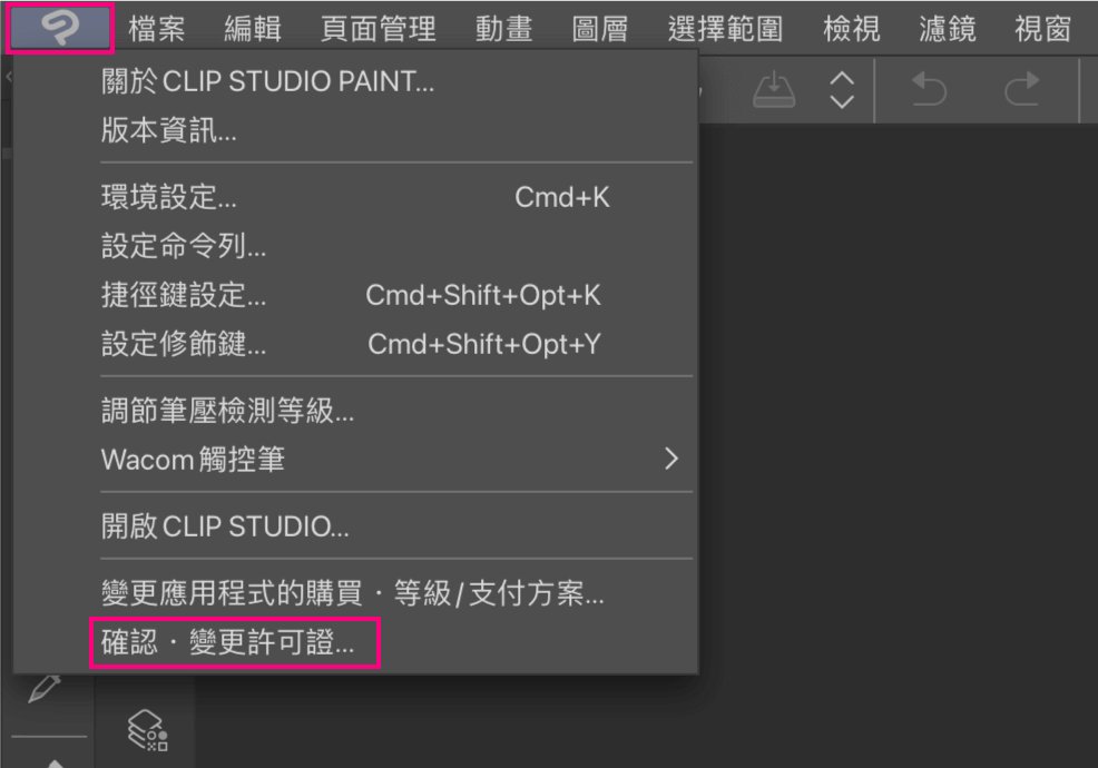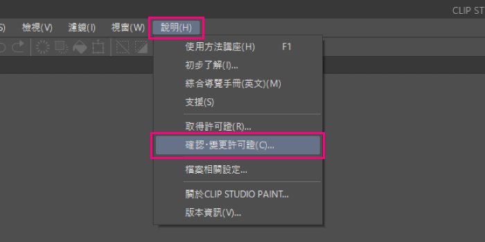 點選[CLIP STUDIO PAINT]選單→[確認・變更許可證]→[所持有的許可證],按下CLIP STUDIO PAINT EX 30天免費的[啟動]按鈕