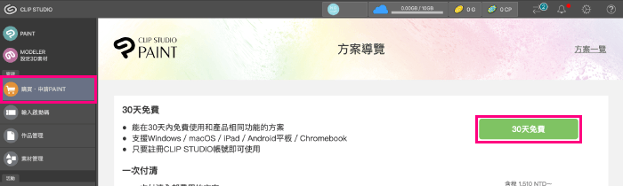 啟動CLIP STUDIO,點選[購買・申請PAINT]→[30天免費]按鈕