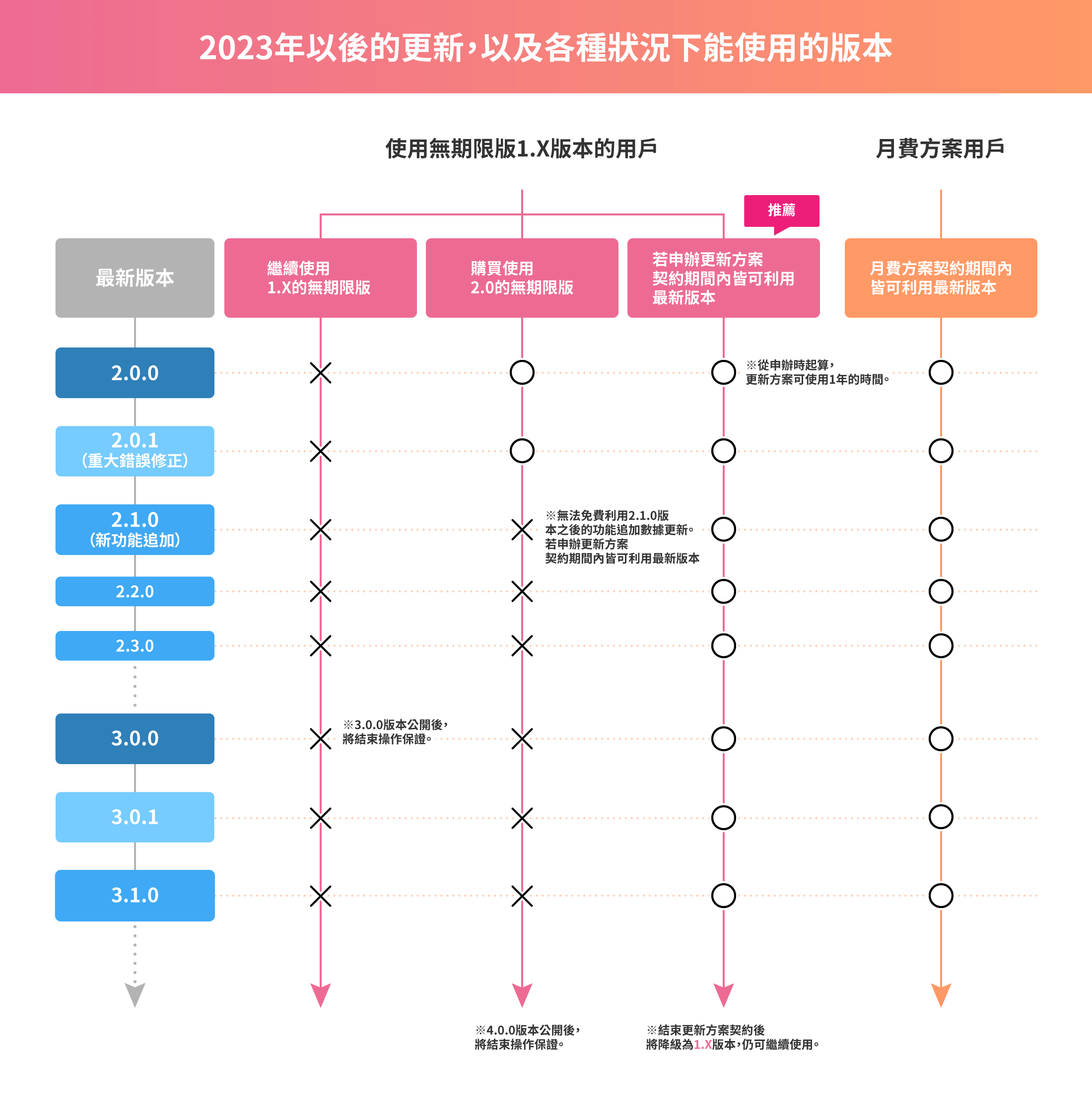 - 針對在2022年1月1日之後購買現行Ver.1無期限版的用戶,本公司將免費提供Ver.2.0無期限版本