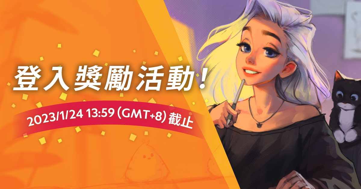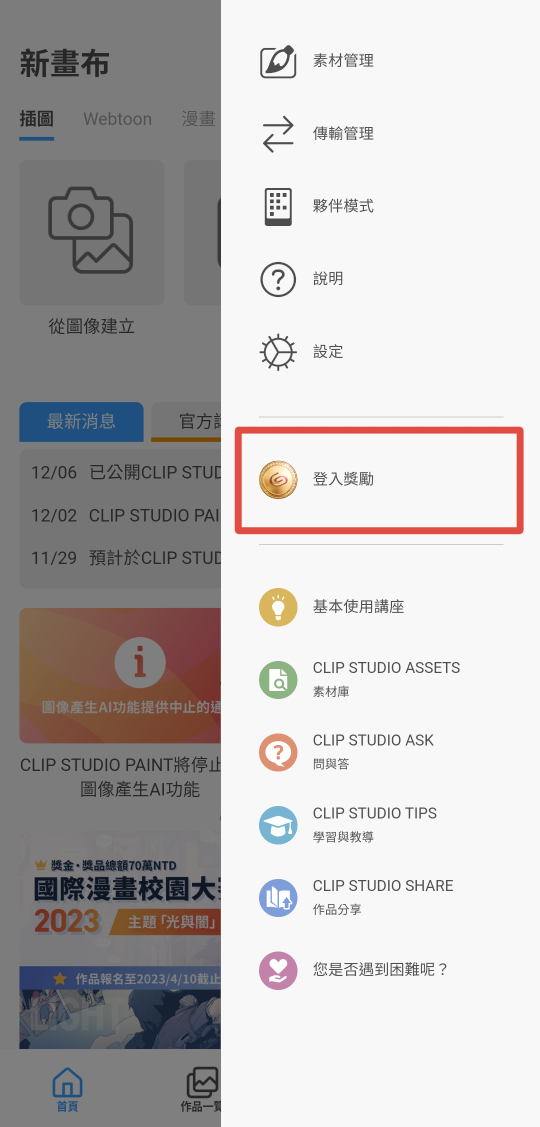 啟動CLIP STUDIO後,點擊選單中的「登入獎勵」,登入CLIP STUDIO帳號即可領取登入獎勵。