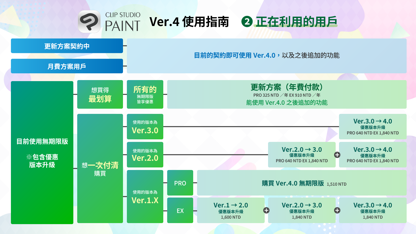 「年費・月費方案(於CLIP STUDIO官網或各App商店申辦)」契約中的用戶,本日起即可更新為Ver.4.0使用。持有Ver.3以下版本的一次付清・無期限版(Windows/macOS)」用戶,可以加入更新方案或透過優惠版本升級來利用Ver.4.0。
