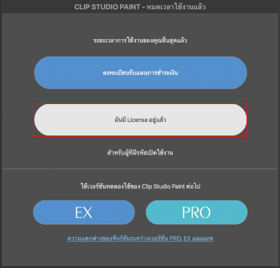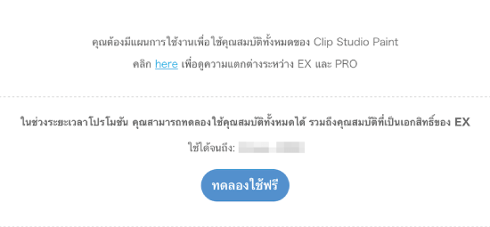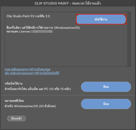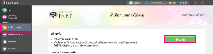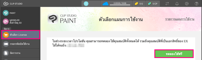 คลิกเปิดใช้งานที่ข้อเสนอใช้งาน Clip Studio Paint EX ฟรี 30 วันใต้เมนู CLIP STUDIO PAINT > ตรวจสอบ/เปลี่ยน License > License ของคุณ