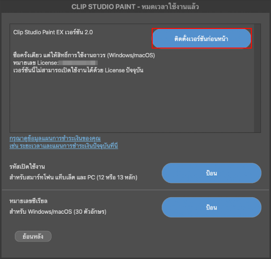 เมื่อแคมเปญสิ้นสุด กล่องข้อความนี้จะปรากฏขึ้น เลือก ฉันมี License > ติดตั้งเวอร์ชันก่อนหน้า