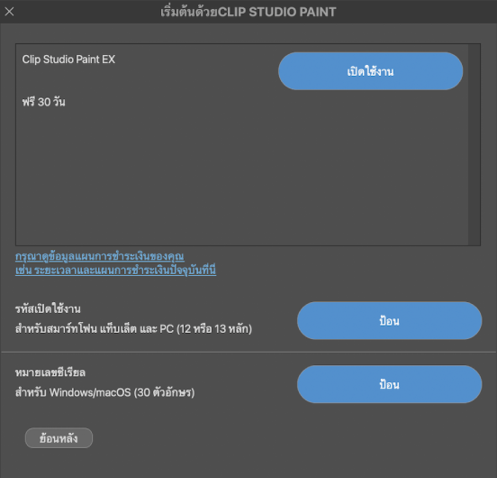 คลิกเปิดใช้งานที่ข้อเสนอใช้งาน Clip Studio Paint EX ฟรี 30 วันใต้เมนู CLIP STUDIO PAINT > ตรวจสอบ/เปลี่ยน License > License ของคุณ