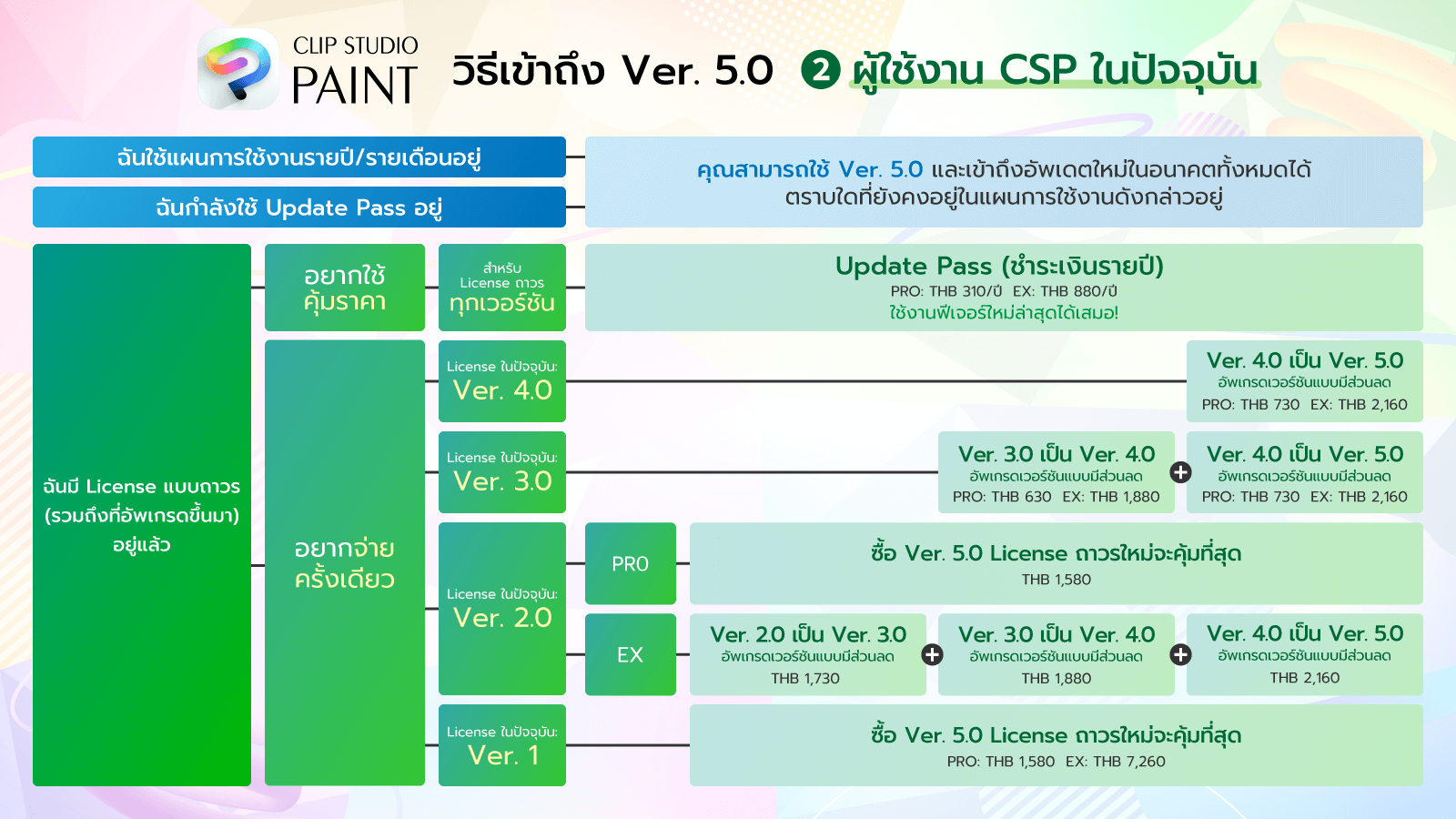 - สามารถซื้ออัพเกรดเวอร์ชันแบบมีส่วนลดจาก Ver. 4.0 → 5.0 หรือสมัครซื้อ Update Pass เพื่อใช้งาน Ver. 5.0 ได้