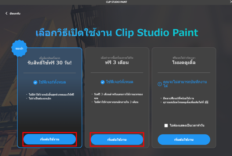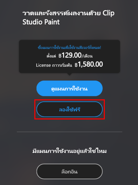 • "เมื่อล็อกอินครั้งแรกรับสิทธิ์ใช้ฟรี 30 วัน!" → เพียงลงทะเบียนบัญชี Clip Studio ก็จะสามารถทดลองใช้ได้ฟรี 30 วัน
