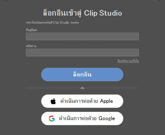 บัญชี Clip Studio สามารถเชื่อมกับบัญชี Apple หรือบัญชี Google ได้