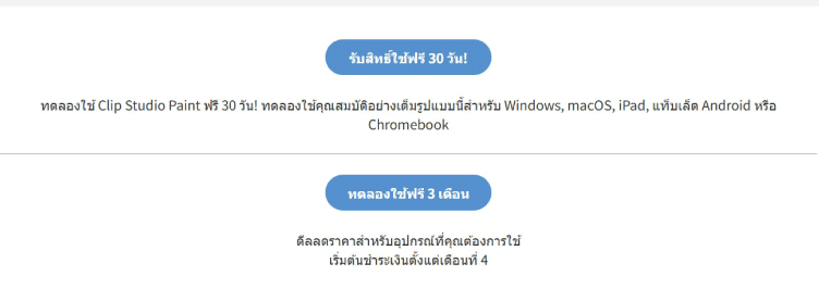 ・ คลิก "รับสิทธิ์ใช้ฟรี 30 วัน!" เพื่อลงทะเบียนบัญชี Clip Studio แล้วรับสิทธิ์ใช้ฟรี 30 วัน