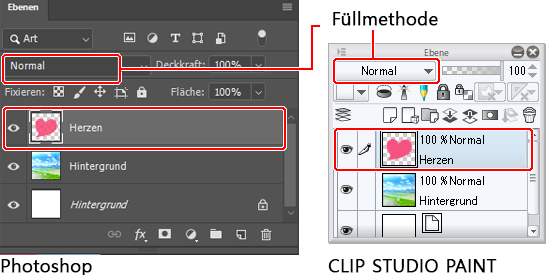 Eine Füllmethode legt fest, wie die Farben einer Ebene mit den Farben der darunterliegenden Ebenen kombiniert werden. Indem eine Füllmethode für eine Ebene eingestellt wird, können verschiedene Effekte kreiert werden.