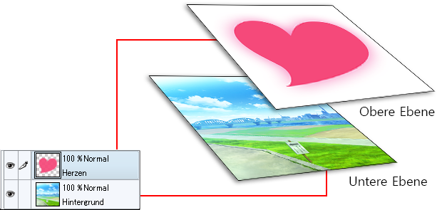 Zur Veranschaulichung der Effekte, den die einzelnen Füllmethoden erzeugen, werden wir sie im folgenden Beispielbild jeweils auf der oberen Ebene (Herz) anwenden.
