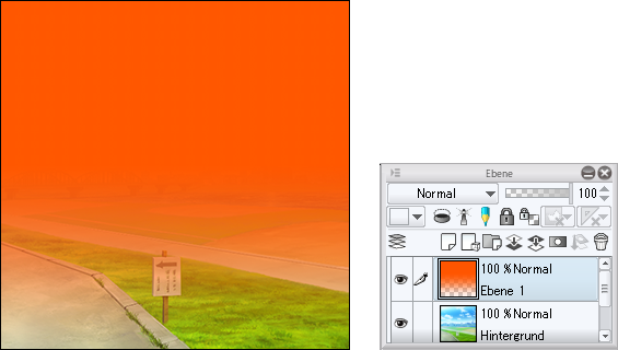 Über dem Landschaftsbild von vorher wurde hier eine Ebene mit einem orangefarbenen Farbverlauf hinzugefügt.