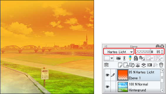 Wähle die Ebene mit dem Farbverlauf aus, stelle die Füllmethode auf [Hartes Licht] und senke die [Deckkraft] auf 85%.