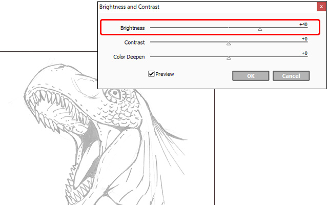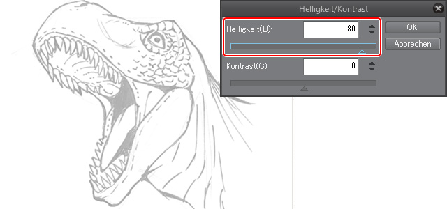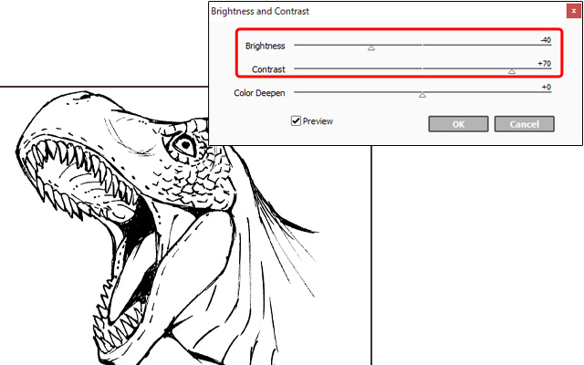 Verwende diesmal die [Contrast] und [Brightness] Schieberegler, um die Linien dunkler zu machen. Achte darauf, dass die Linien nicht zu dick werden oder über die Originallinien hinausgehen.