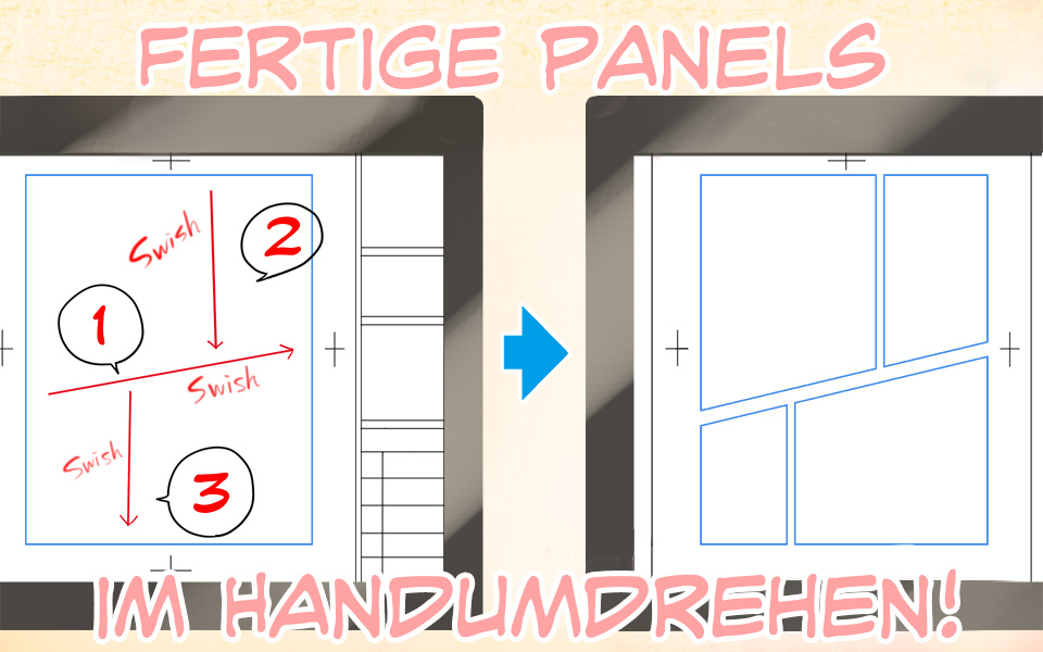 Beim digitalen Zeichnen kann die Linienbreite ganz einfach umgestellt werden. Die Erstellung der Panels ist zwar bei jedem Zeichenprogramm anders, aber wenn das Programm auf das Zeichnen von Comics und Manga spezialisiert ist, gibt es sogar spezielle Panel-Tools für eine wirklich einfache Panel-Aufteilung. Bei anderen Programmen, wie z. B. Photoshop, können die Vierecke für die Panels mit dem Figur-Tool erstellt werden.