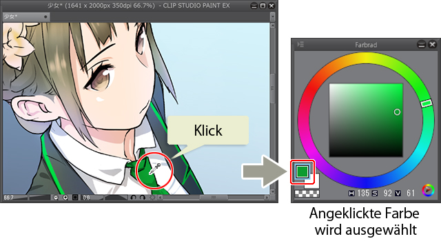 Drücke die [Alt]-Taste, um von deinem Zeichentool zur [Pipette] zu wechseln, und klicke auf eine beliebige Stelle auf der Leinwand, um von dort die Farbe aufzunehmen.