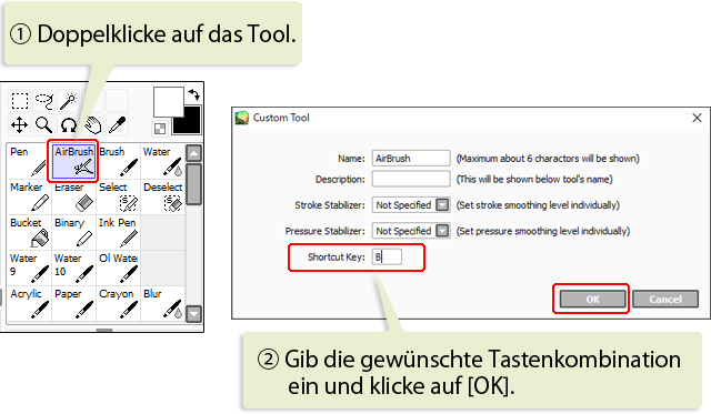 Um einen Tastaturbefehl für ein Tool zuzuweisen, doppelklicke auf das entsprechende Tool. Im darauffolgenden [Custom Tool] Dialogfeld kannst du unter [Shortcut Key] die gewünschte Tastenkombination eingeben.