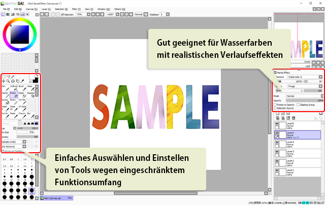 PaintTool SAI ist ein englischsprachiges Zeichenprogramm, das für sein benutzerfreundliches Interface mit hervorragenden, natürlich zeichnenden Pinseln und für die Einfachheit von Korrekturen bekannt ist. Dafür ist der Funktionsumfang aber etwas begrenzt. Beispielsweise gibt es keine Text-, Form- oder Farbverlaufstools. Um Illustrationen für die Online-Veröffentlichung zu zeichnen, ist das Zeichenprogramm aber völlig ausreichend.