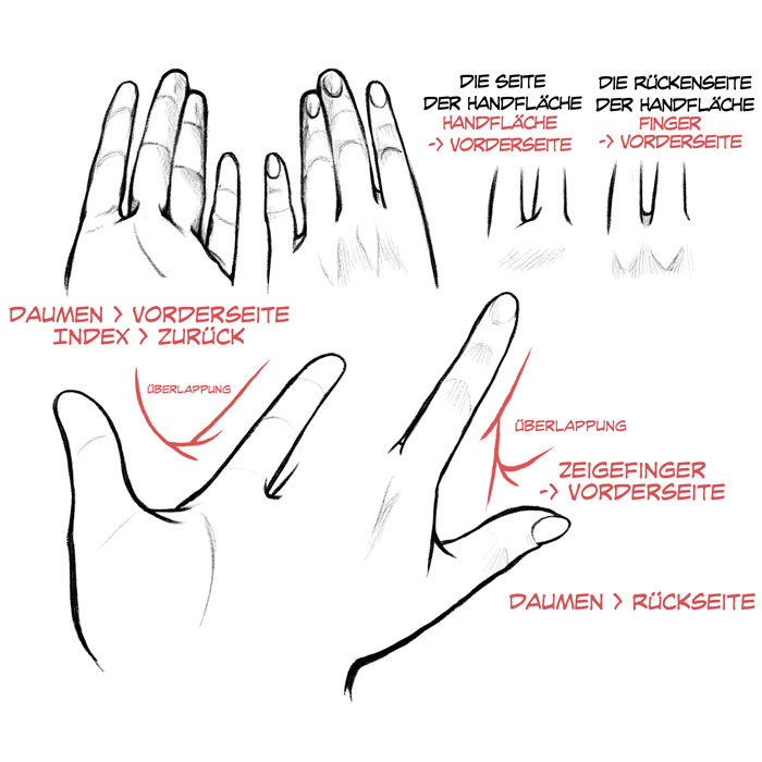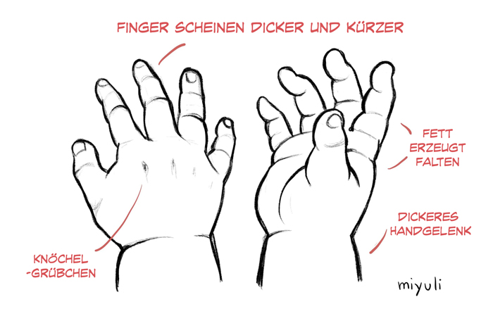 Um das Bewegen zu ermöglichen, ist die Haut an den Gelenken relativ locker und dünn. Die Beugemarkierungen auf der Handflächenseite müssen nicht unbedingt mit den Gelenken übereinstimmen. Diese Linien sind in einfachen Zeichenstilen möglicherweise nicht sichtbar. Wenn du jedoch weißt, wo sie sich befinden und wo sich die Haut überlappt, kann dies beim Zeichnen der Fingerbeugung hilfreich sein.
